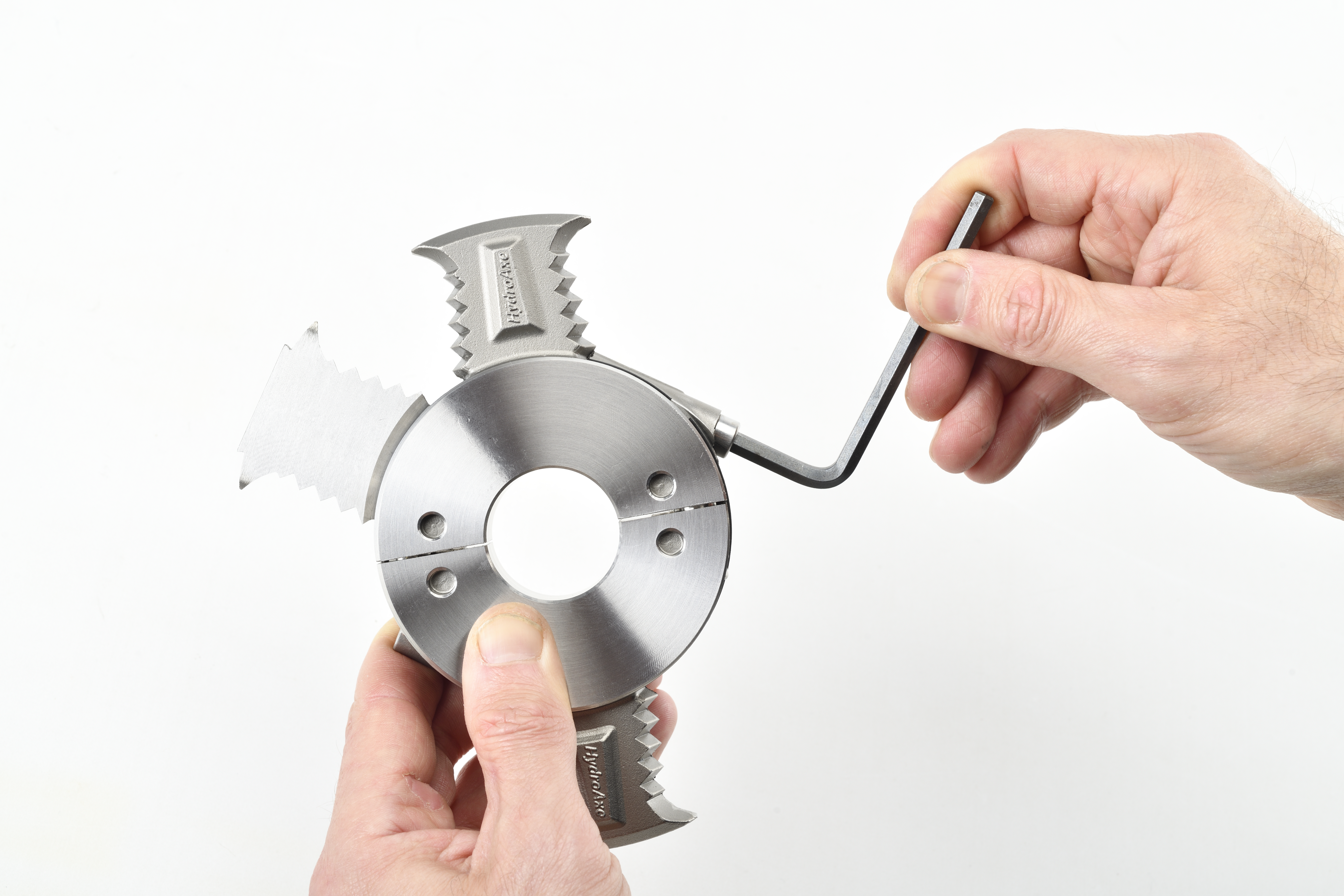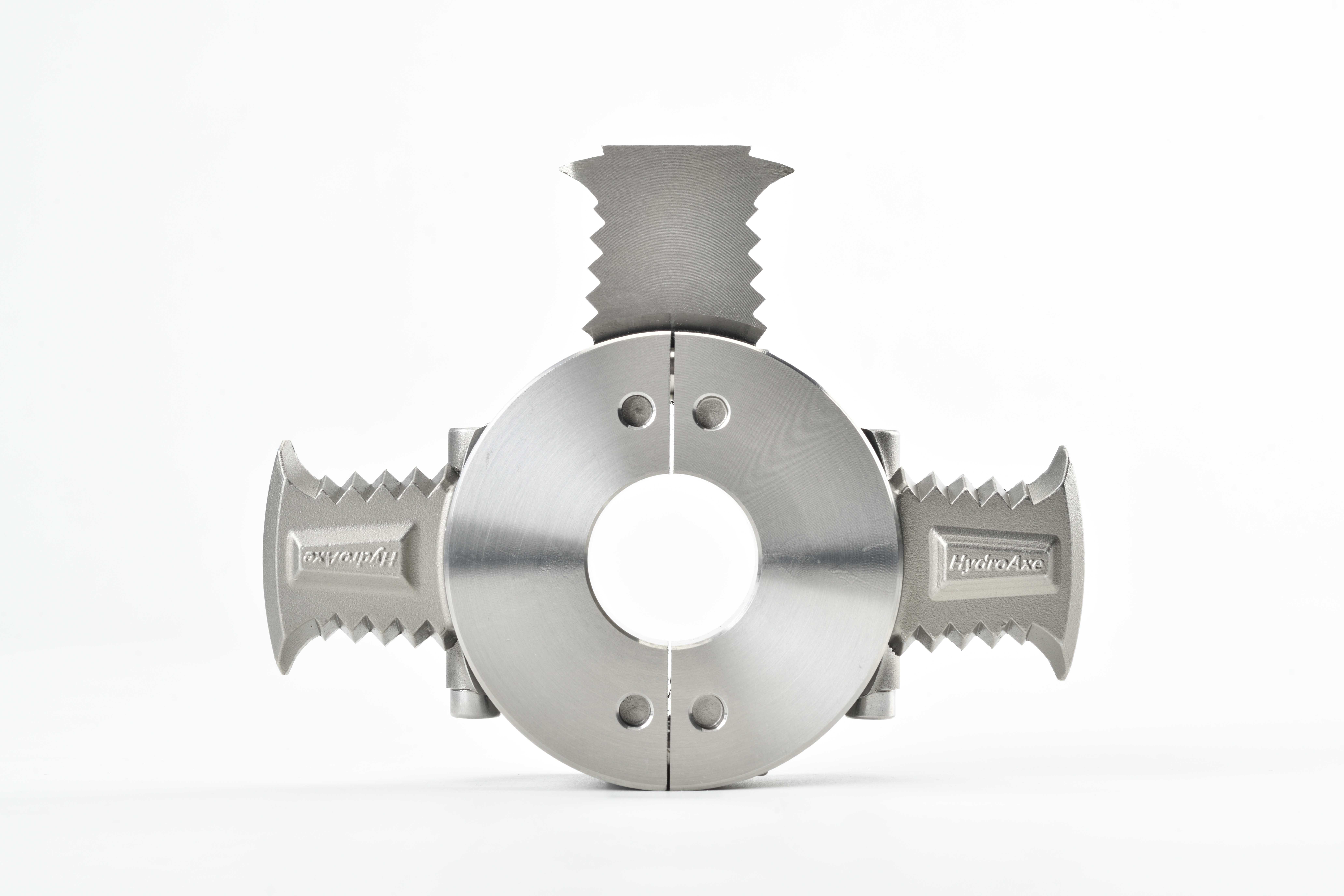 The HydroAxe Scissor Action Rope Cutter utilises a fixed stationary blade secured by a mounting block fixed to the bearing housing and a 2 Blade cutter that is secured to the shaft to provide an aggressive scissor type action – scroll down to see a video of this cutter in action!